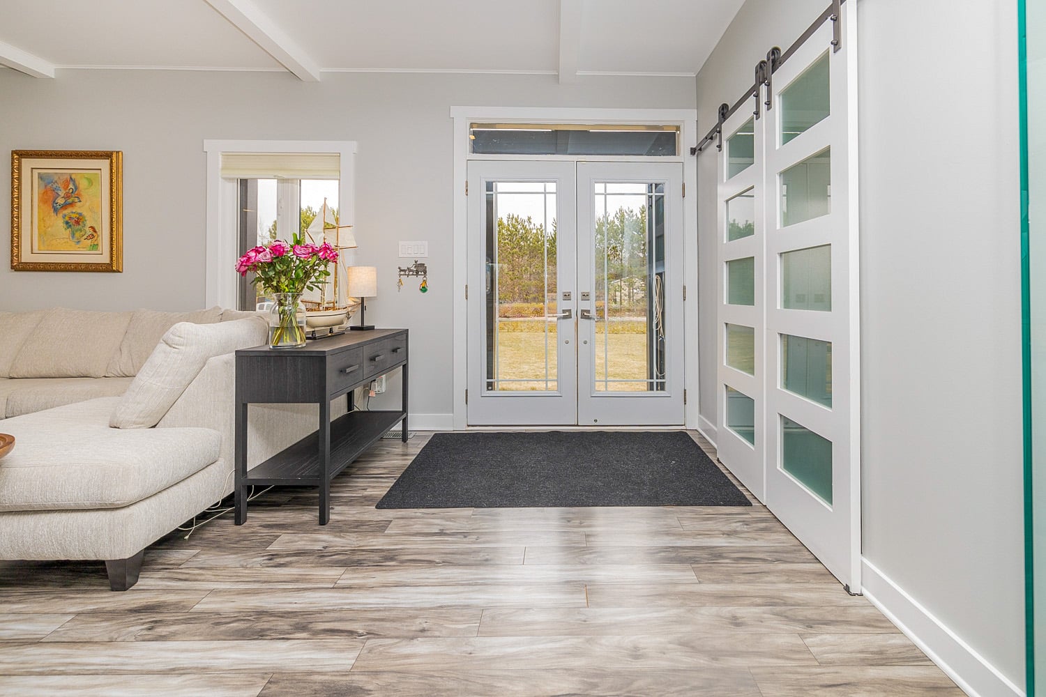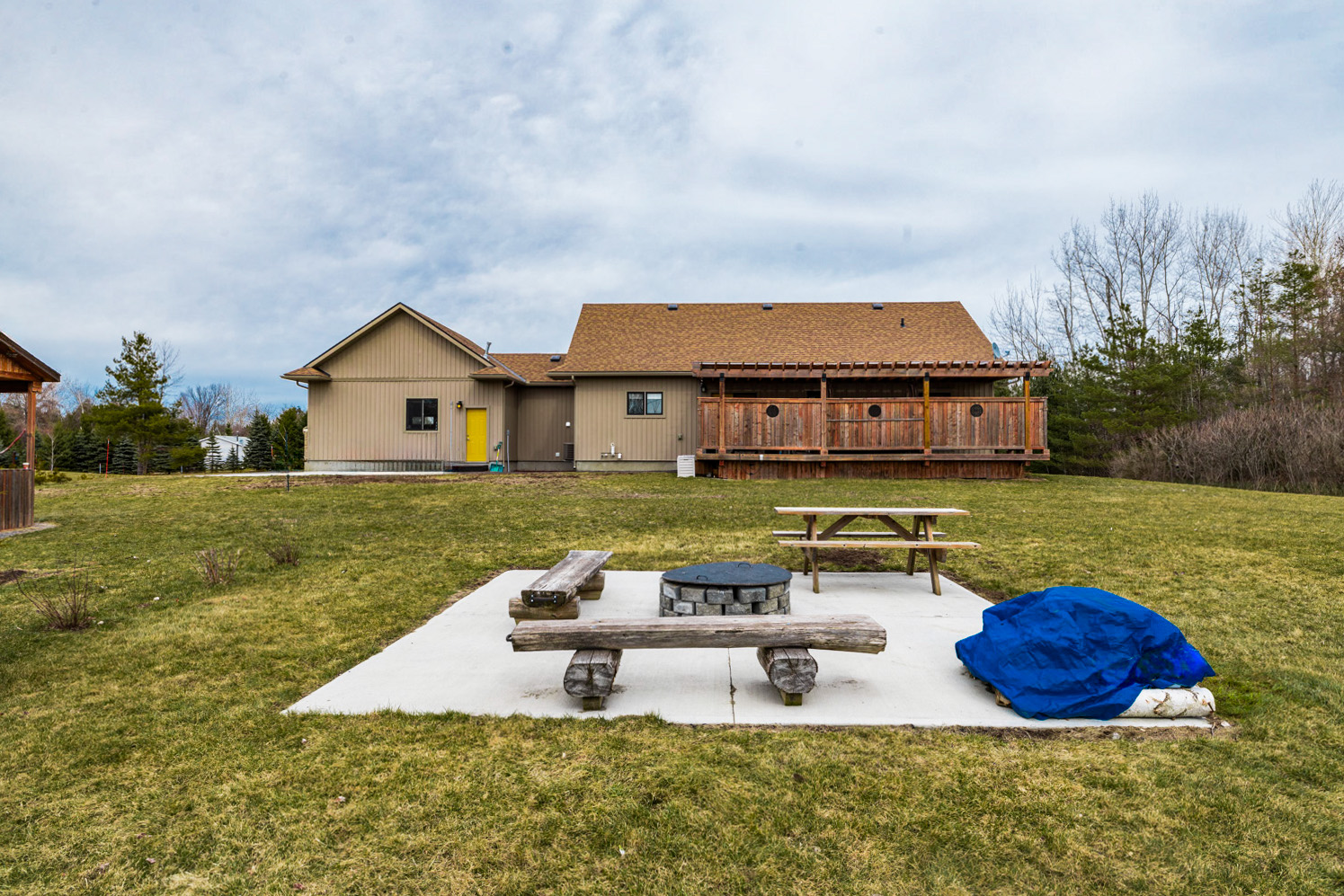 Open-concept main floor with gas fireplace and full-length deck.